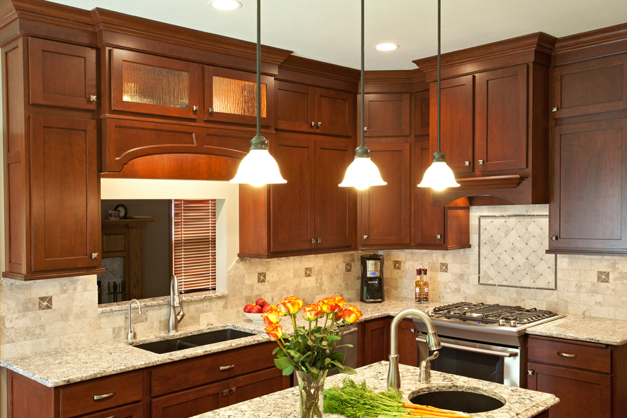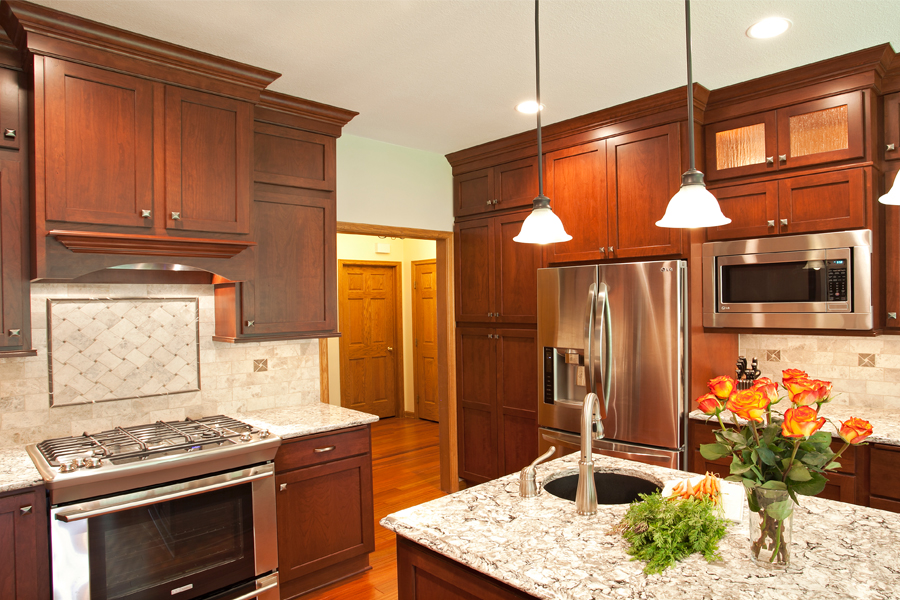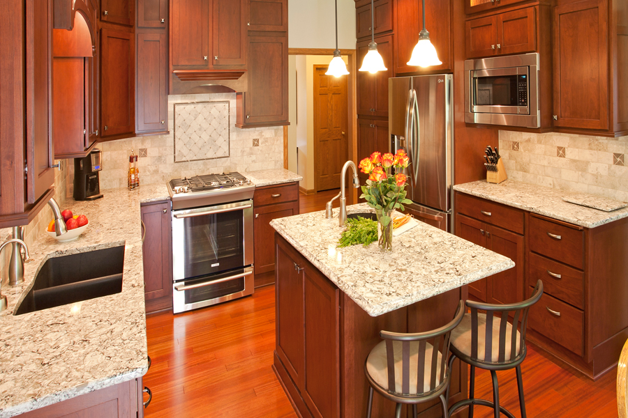 This 1990s all oak kitchen with almond-colored laminate countertops and a patterned vinyl floor served its family like a champ for over 20 wonderful years. After the kids were grown up, moved out, and off to begin their own adventures, it was time for the kitchen to get a makeover. The remodeled kitchen begins life anew with warm cherry cabinetry, flowing Cambria countertops, Brazilian cherry floors, stainless appliances, and a classic marble backsplash.